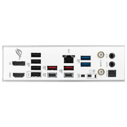 The motherboard features high-fidelity audio components designed to deliver crisp vocals, detailed soundscapes, and immersive gaming experiences. Aesthetically, the white ROG Strix design, cyber-inspired detailing, and full Aura Sync RGB support make it a perfect match for white-themed builds and RGB-heavy gaming rigs.